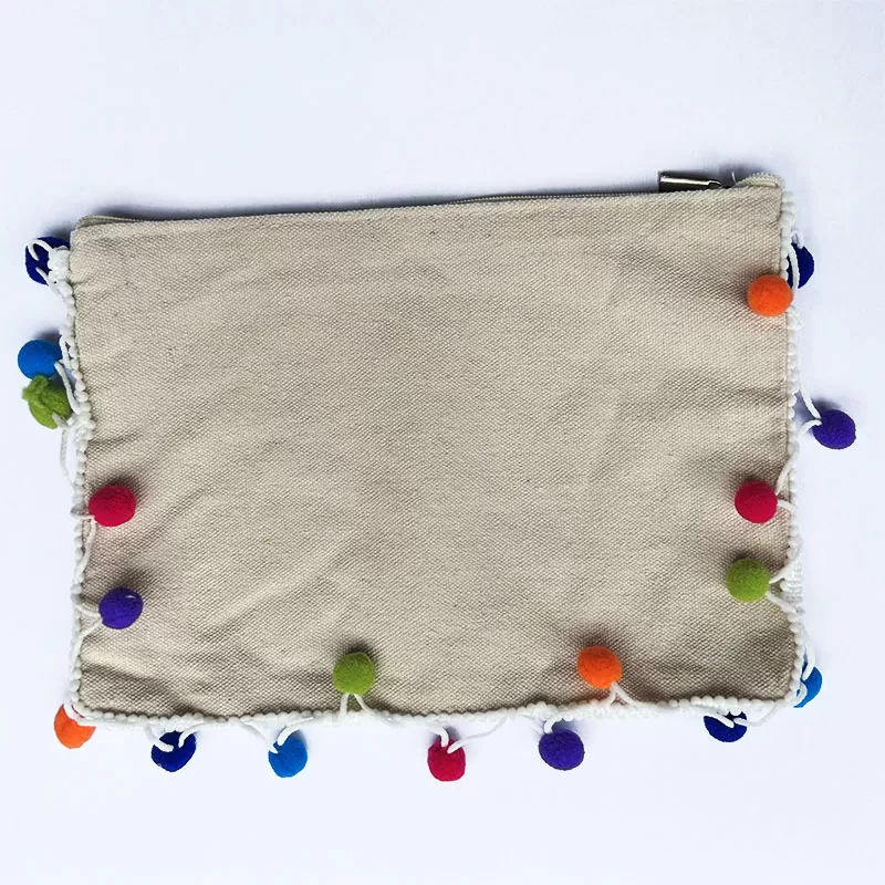 Pour commencer coudre le ruban à petits pompons sur les bords de la pochette.