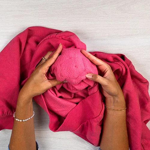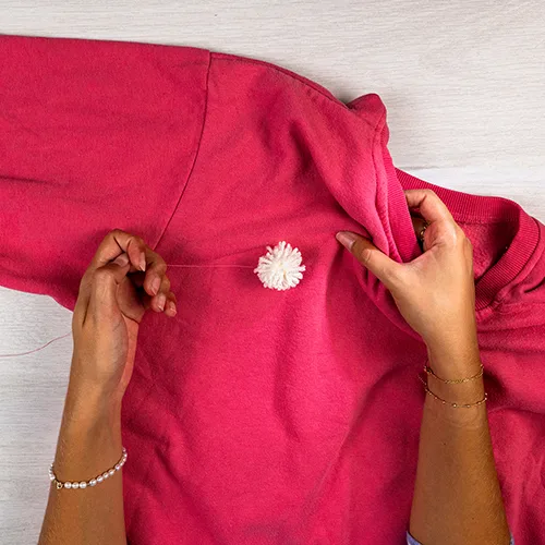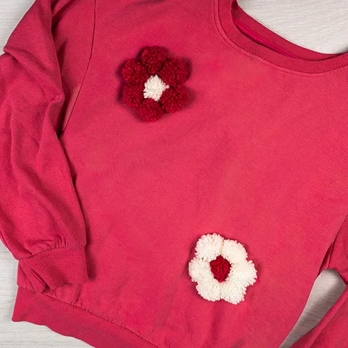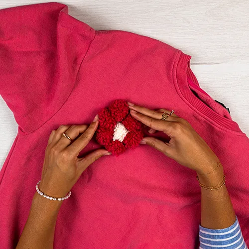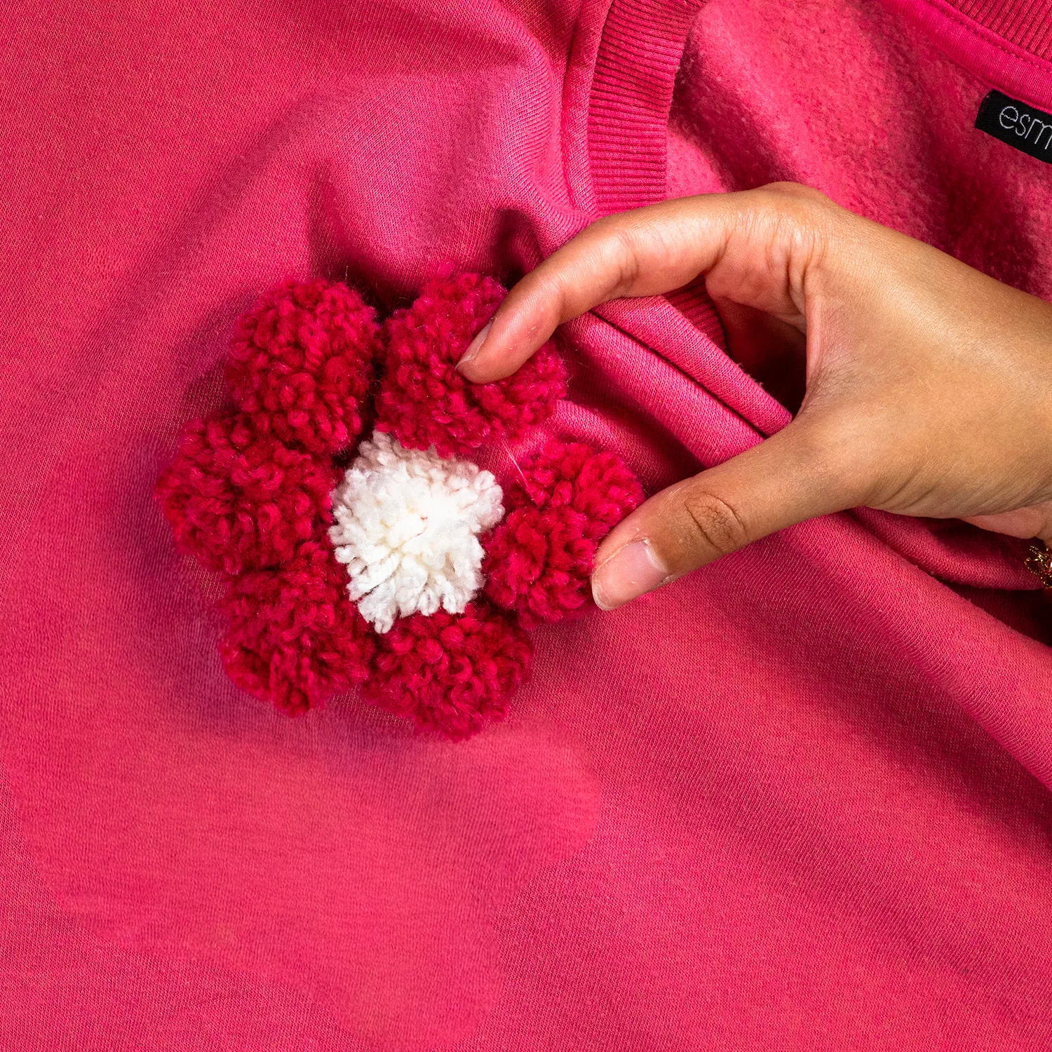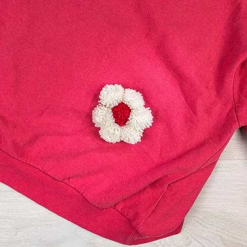Reprenez votre fil et attachez chaque pompon pétale au sweat pour bien maintenir la fleur en place. Nouez les fils à l’intérieur, puis coupez l’excédent.