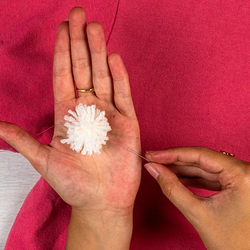 Enfilez votre fil dans l’aiguille, doublez-le pour plus de solidité et fixez un premier pompon au sweat : ce sera le cœur de votre fleur.