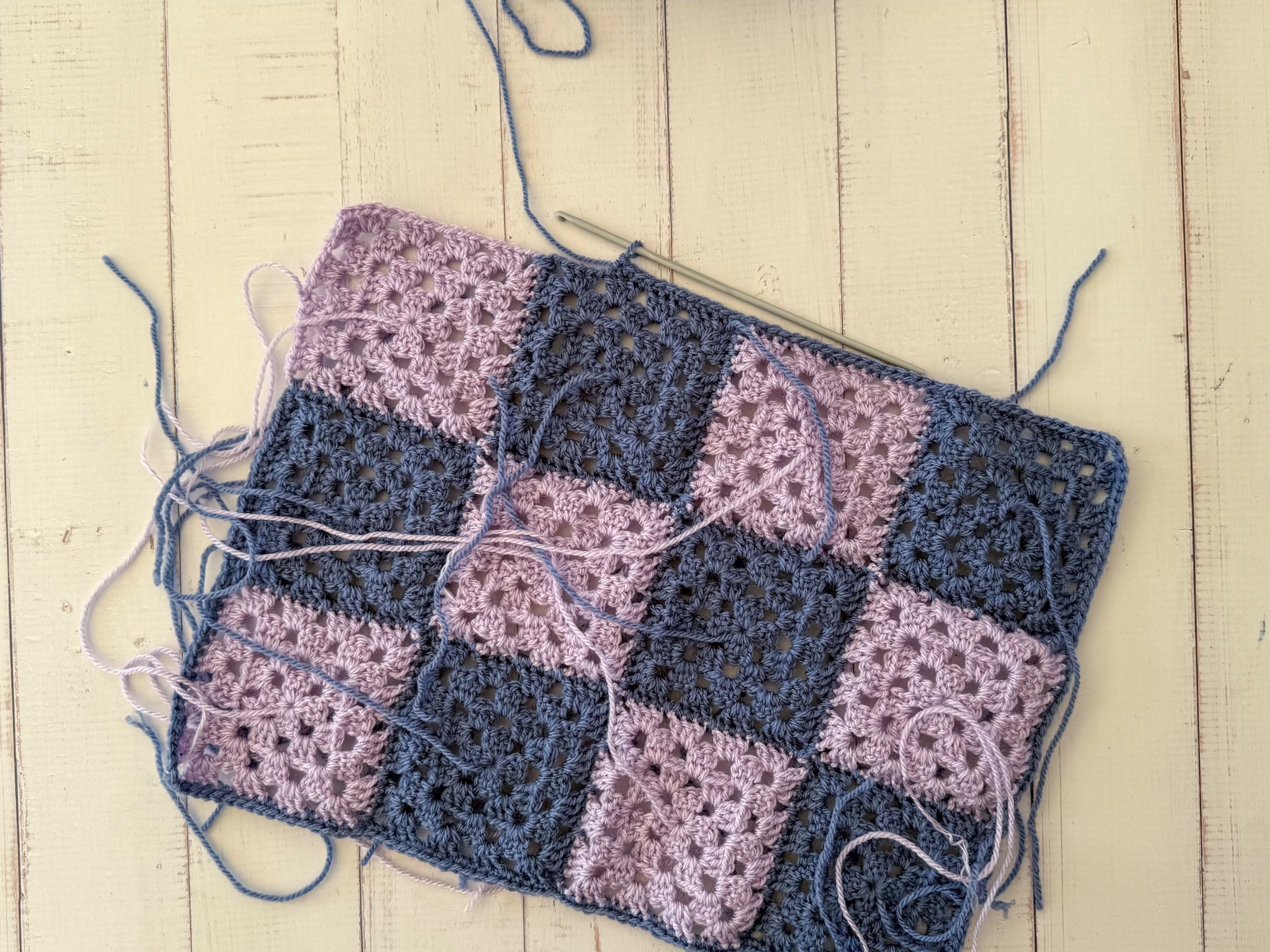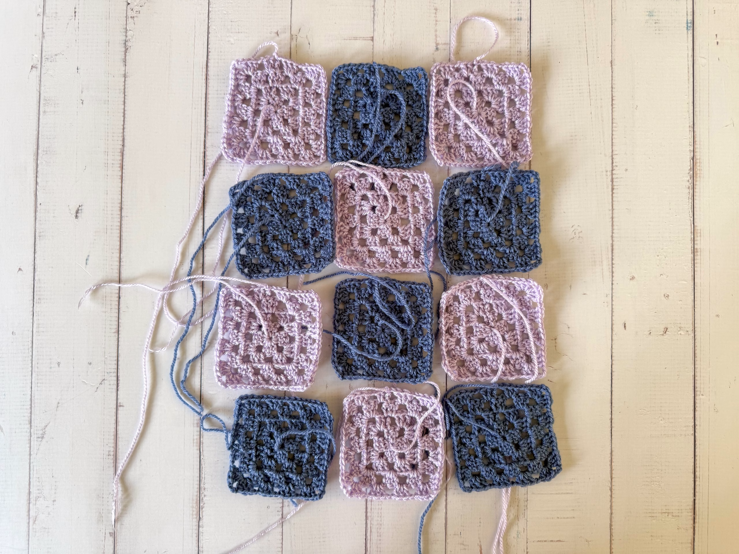 Prenez vos materiel et commencez par crocheter 12 carrés grannies avec 4 rangs de brides. Pour faire le motif en damier, faites 6 carrés dans un coloris et 6 dans un autre.