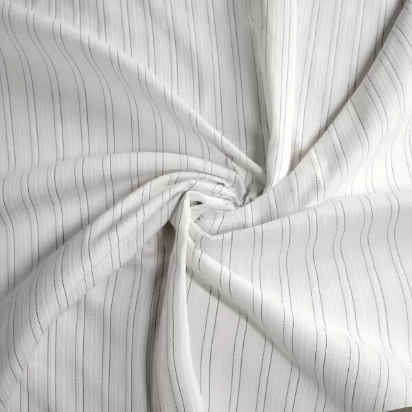 Tissu texturé blanc à fines rayures noires. De haute qualité, ce tissu est parfait pour vous accompagner dans tous vos projets de couture.